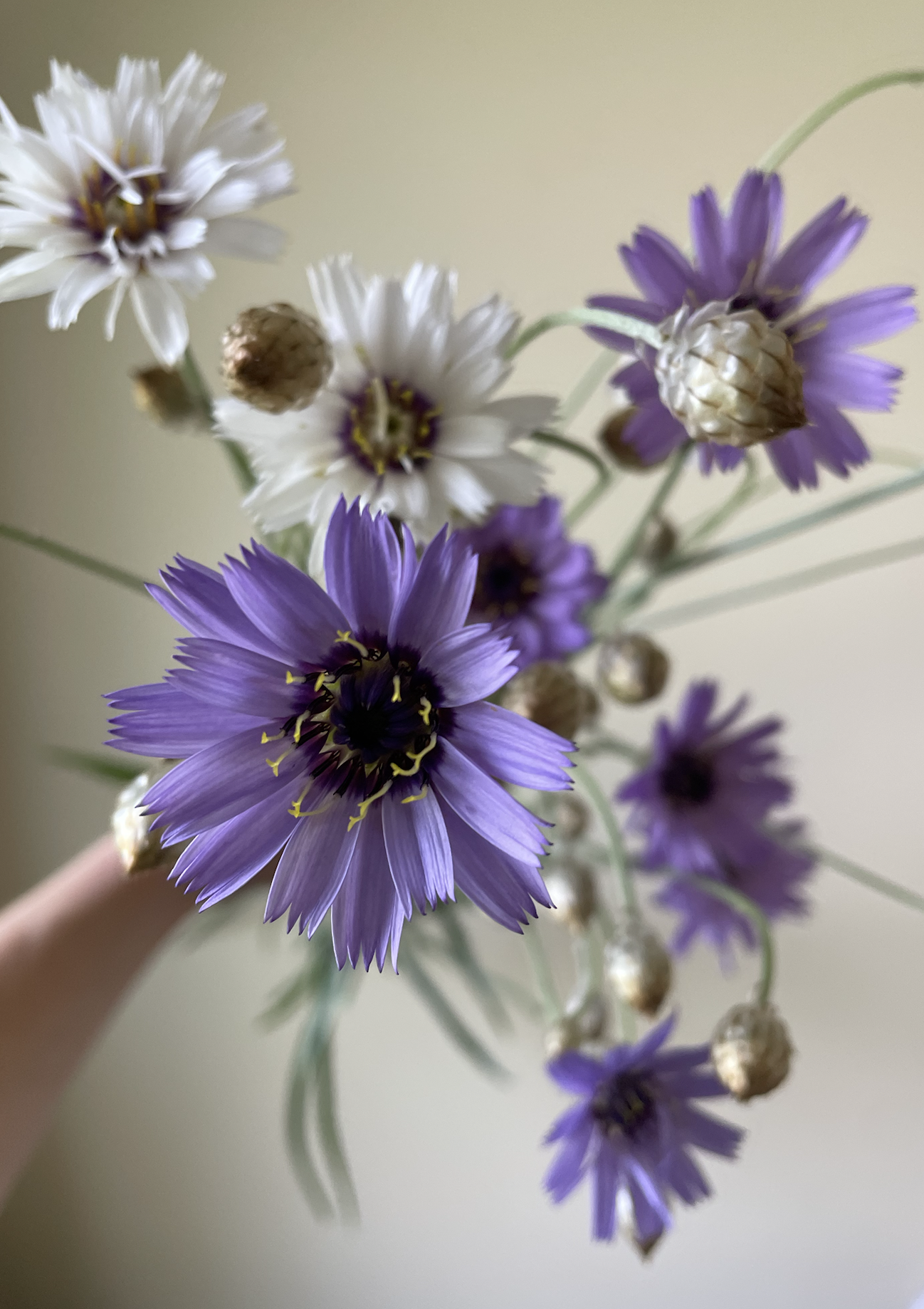 Welcome back! The cupid’s dart is getting ready to bloom in full force here, so I thought I’d take a minute and share this intriguing perennial with you. Cupid’s Dart (catananche) is a short-lived perennial, but it can self sow if you have open soil. We grow both the white and blue versions. In addition to the flowers, I also love the iridescent buds and seed pods after flowering. The buds and pods add a nice whimsical element to personal flowers.