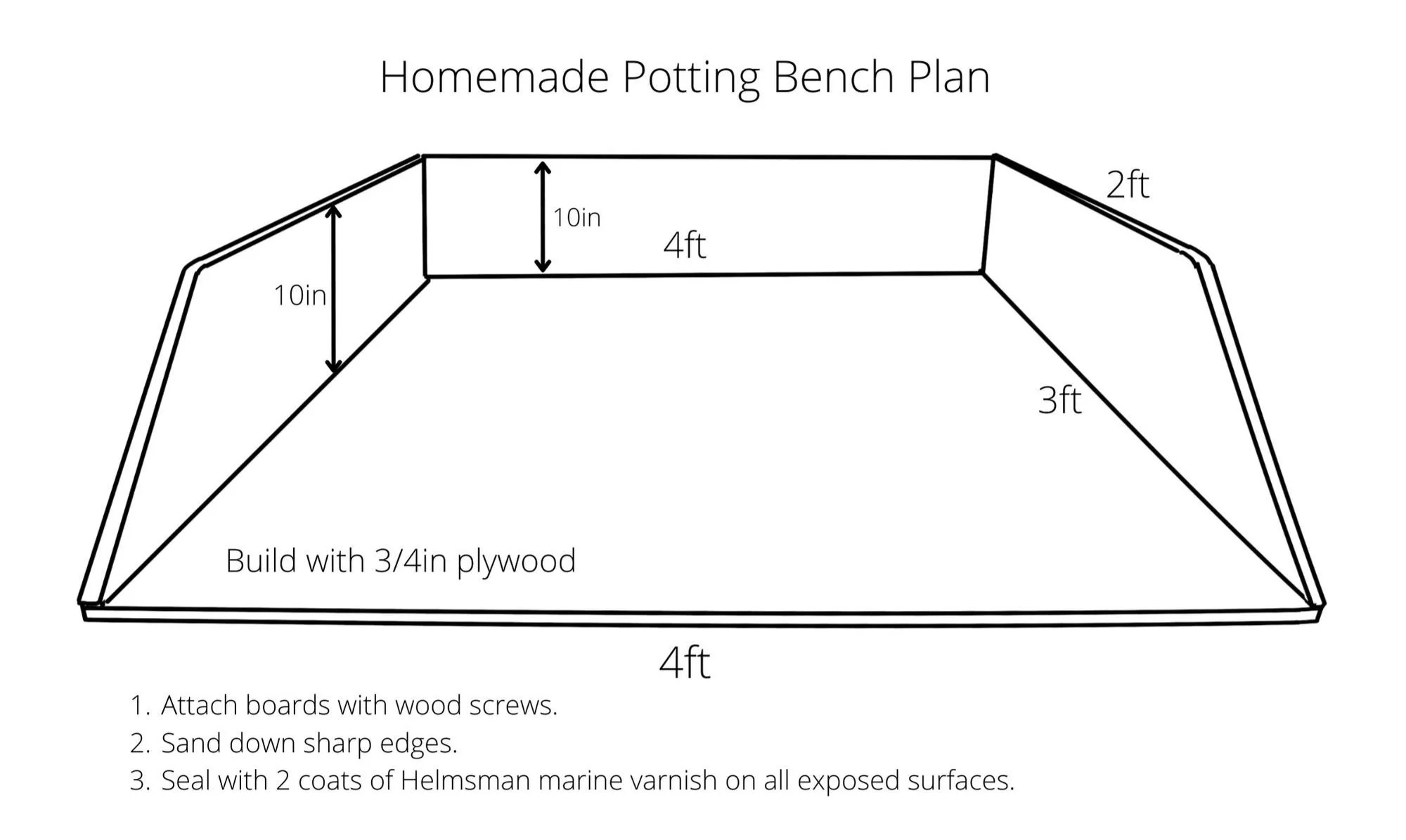 The boards are screwed together with wood screws. I recommend using the assistance of a 90 degree corner clamp tool or a carpenters square and some extra hands to help with construction. The plywood is sealed with marine varnish - a rugged sealant meant to take the punishment of humidity and water. We sealed all sides and edges of the potting bench with 2 coats of varnish.