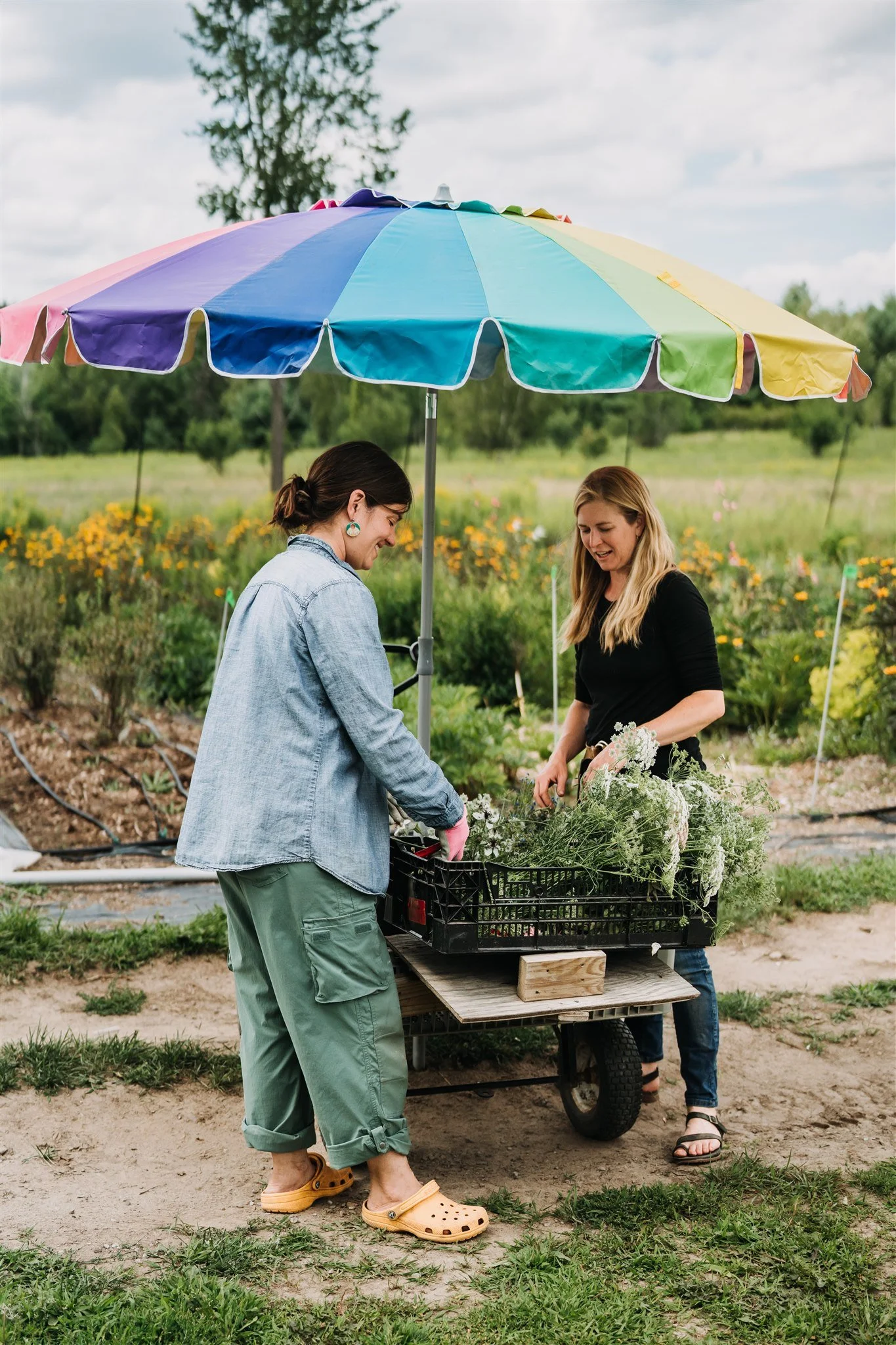 We added a large beach umbrella to one of our garden carts for the purpose of field harvesting and processing. A small wooden shelf on the back holds a bulb crate to collect the leaves we strip. The composting station is near the flower cooler, so the flowers are bunched and moved to the cooler and the leaves are left at the composting station at the same time. There is another post here on the Pro Platform with information about these carts.