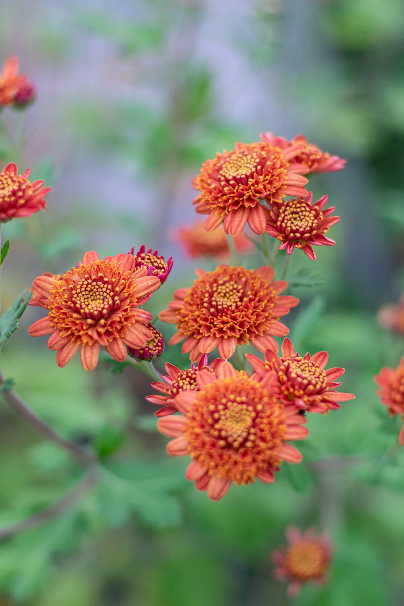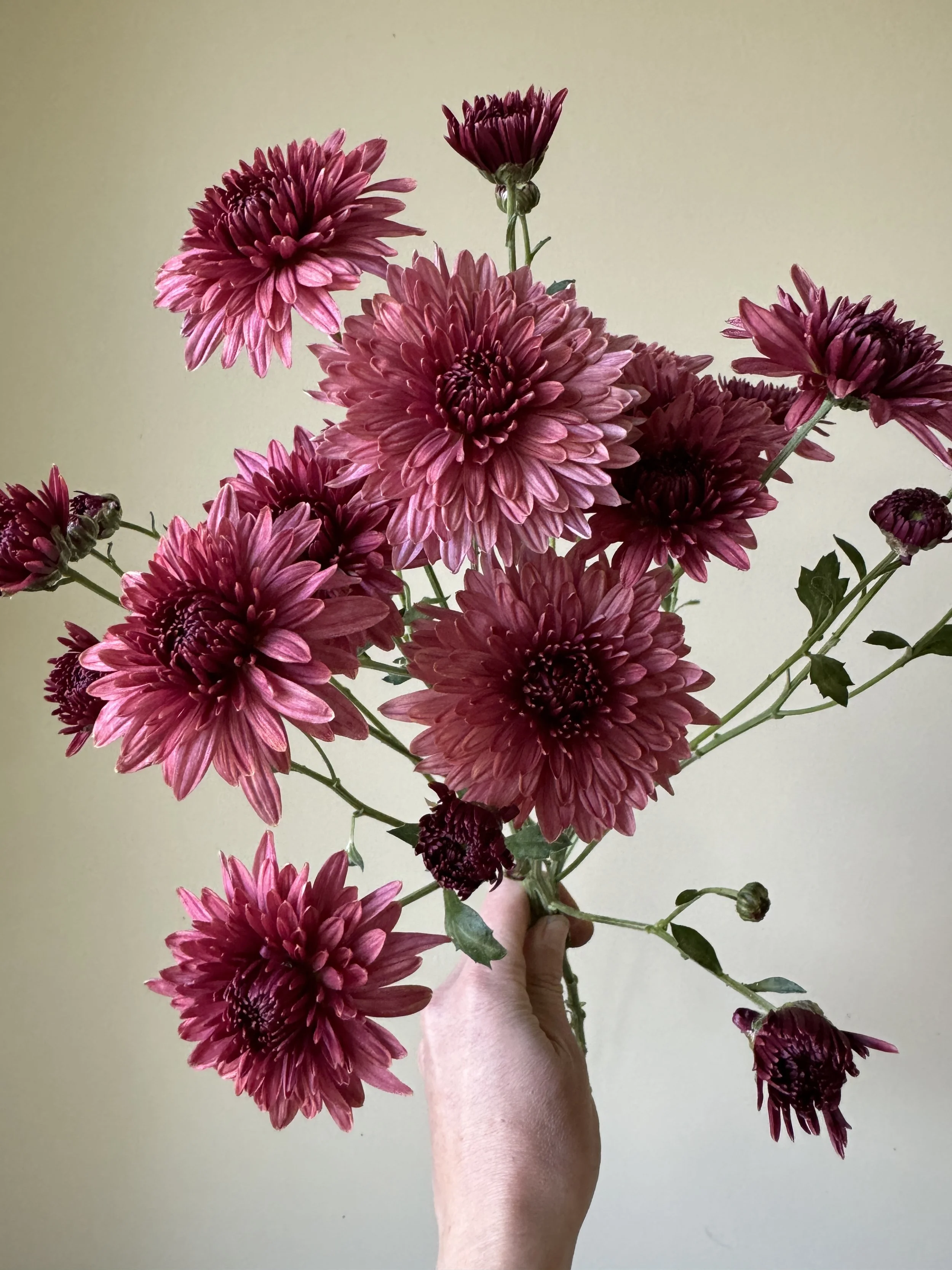 Mums are a mainstay of our fall cut flower production and they often fill our market bouquets alone, with no additional greenery or other flowers. They come in a wide range of sizes and forms, and its easy to build arrangements and bouquets that show a variety of color, texture, and shape using mums alone.