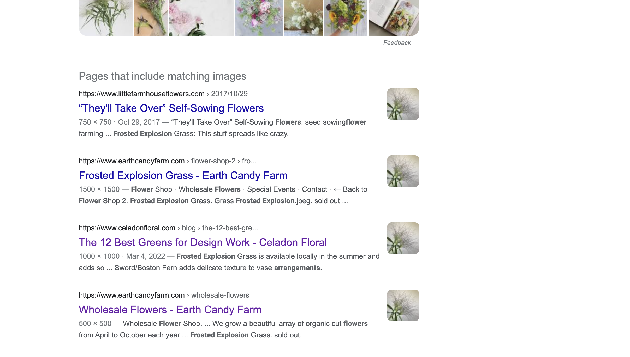 Here is another example. I once googled “Frosted Explosion Grass” - a product we grow here and I just happened to be on the “image” results tab. Holy wow. A TON of wholesale online flower distributors were using my image as their own to sell this product. I took no action that time, because I was a bit overwhelmed. It seemed like my image had just become public domain even though I know that can’t be. Here is the image. Pretty simple. It was made the same way I’ve taught you to photograph single products for wholesale: